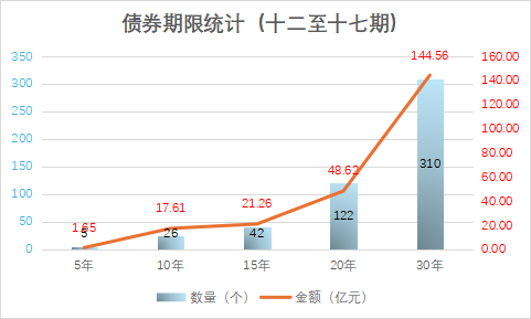 本次發(fā)行項(xiàng)目十二至十七期中債券期限包含5年、10年、15年、20年、30年。其中30年長期限項(xiàng)目合計(jì)310個(gè),占全部發(fā)行項(xiàng)目的61.39%,30年長期限項(xiàng)目也是發(fā)行金額最多的,總?cè)堪l(fā)行金額的61.86%。