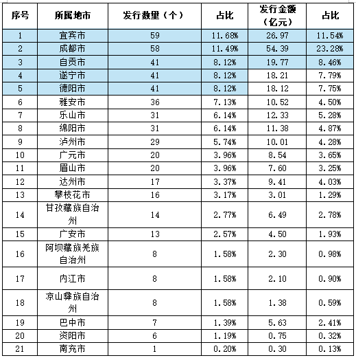本次專項(xiàng)債券發(fā)行十二至十七期中,四川省18個(gè)地級(jí)市和3個(gè)自治州均有項(xiàng)目。其中發(fā)行項(xiàng)目數(shù)量前五的分別為宜賓市59個(gè)、成都市58個(gè)、德陽市41個(gè)、遂寧市41個(gè)、自貢市41個(gè);發(fā)行金額前三的分別為成都市54.3930億元、宜賓市26.9712億元、自貢市19.7727億元。具體分布如下表: